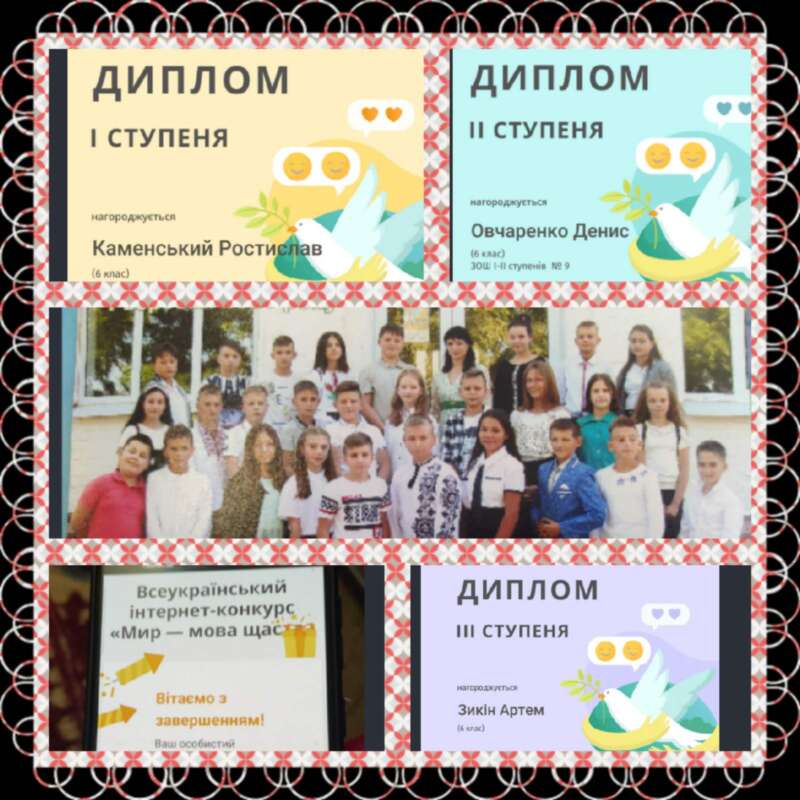 21 вересня 2021 року учні 6 класу Охтирської ЗОШ І-ІІ ступенів № 9, взяли участь у Всеукраїнському інтернет - конкурсі "Мир - мова щастя". Виконуючи завдання, учні дізналися, які норми та правила допоможуть їм побудувати справедливий світ, жити у злагоді один з одним. Порадували учні і призовими місцями: дипломами за здобуте 1 місце нагороджено 3 учнів, 2 місце - 5 учнів і 3 місце - 3 учнів.